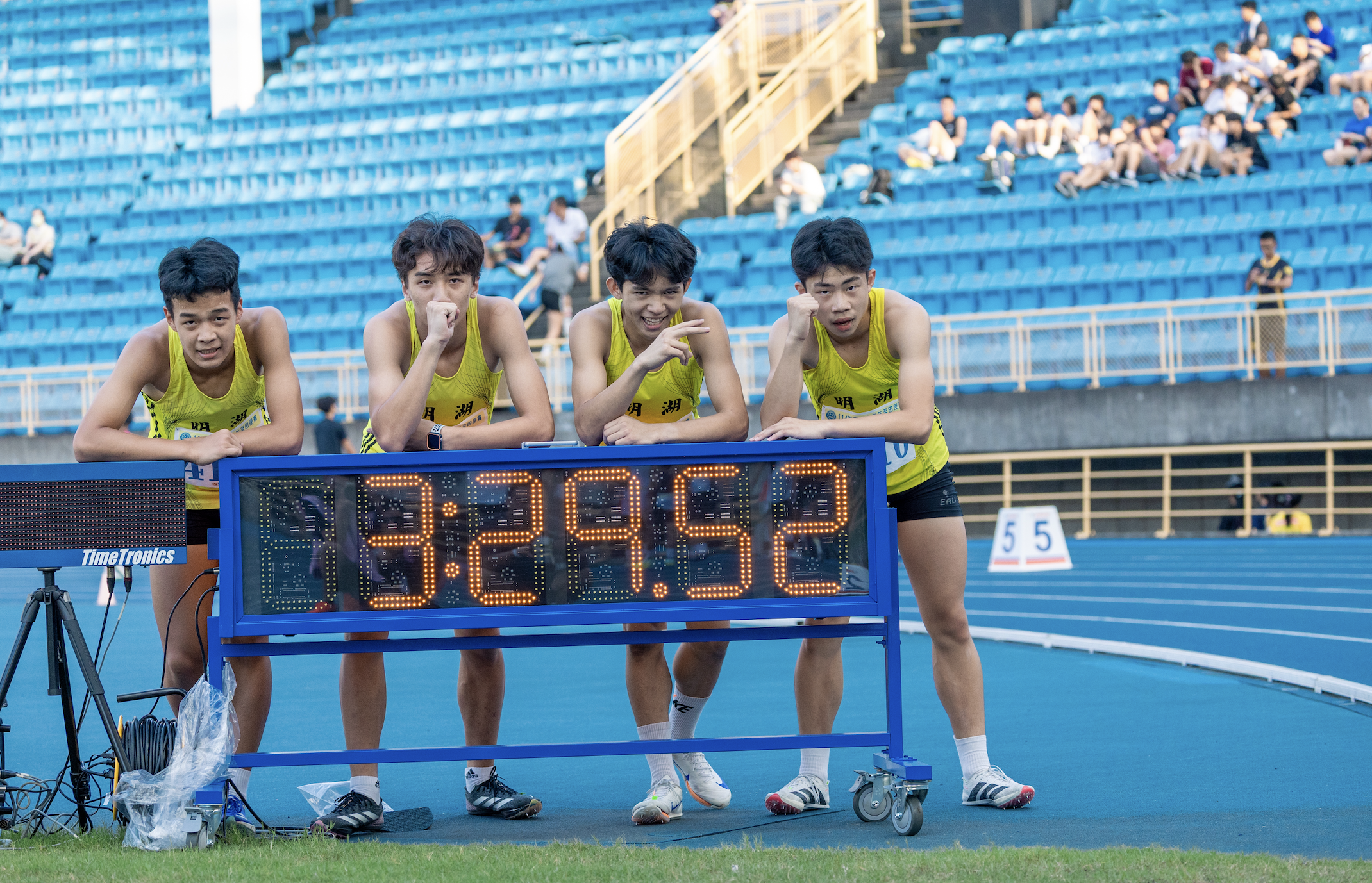 114年臺北市青年盃田徑賽持續進行中,在國中男子組4×400公尺接力決賽中,來自臺北市明湖國中的選手劉定一、林家樂、孫博志、何宇倫表現出色,最終以3分29秒51的成績衝線,打破原有大會紀錄3分32秒45。